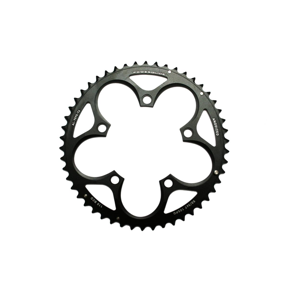 SRAM Road 50 teeth 4 mm chainrings are stamped from 7075-T6 aluminium with black hard anodized finish. PowerGlide ramps/pins for optimized shifting performance. Number of bolts: 5. 110 mm bolt circle diameter.